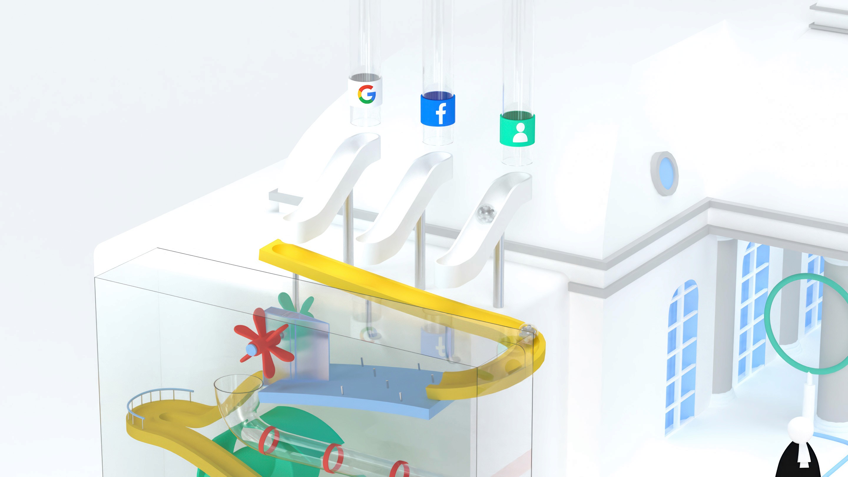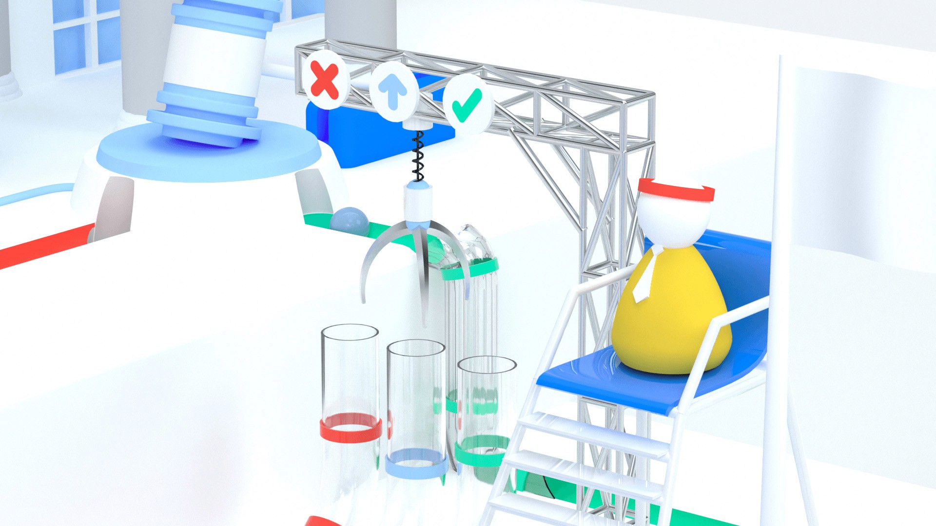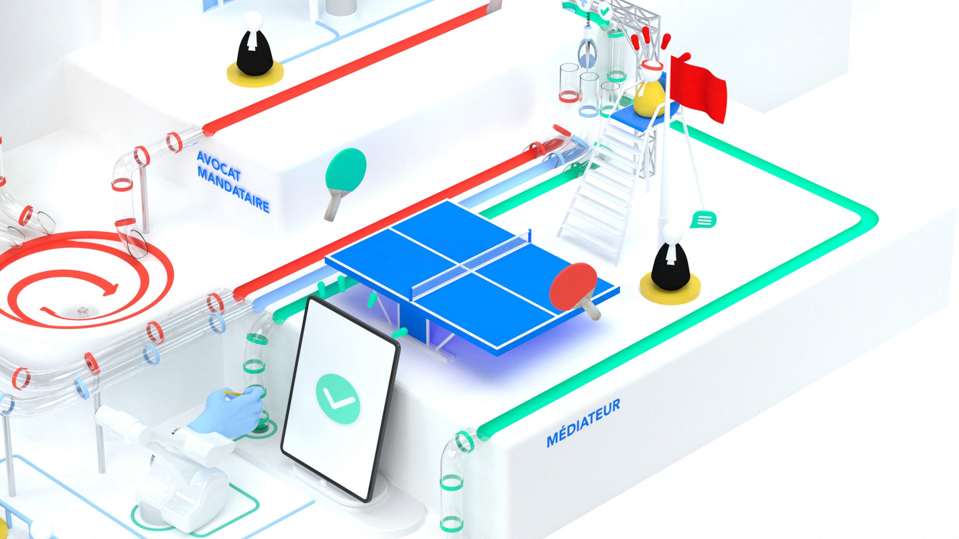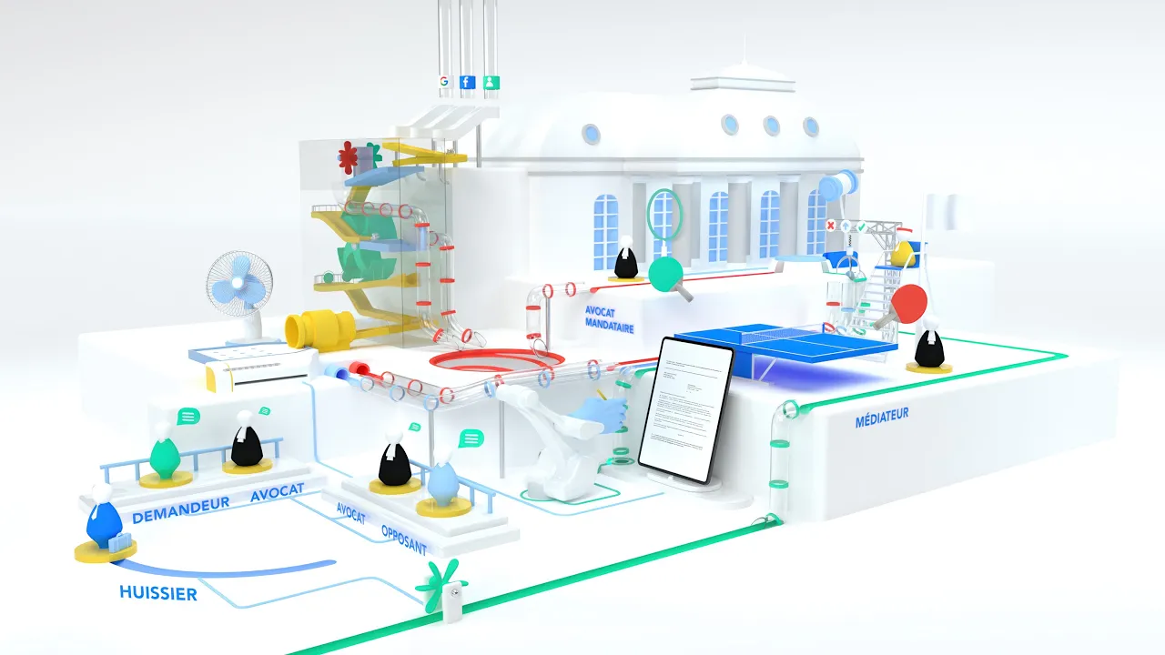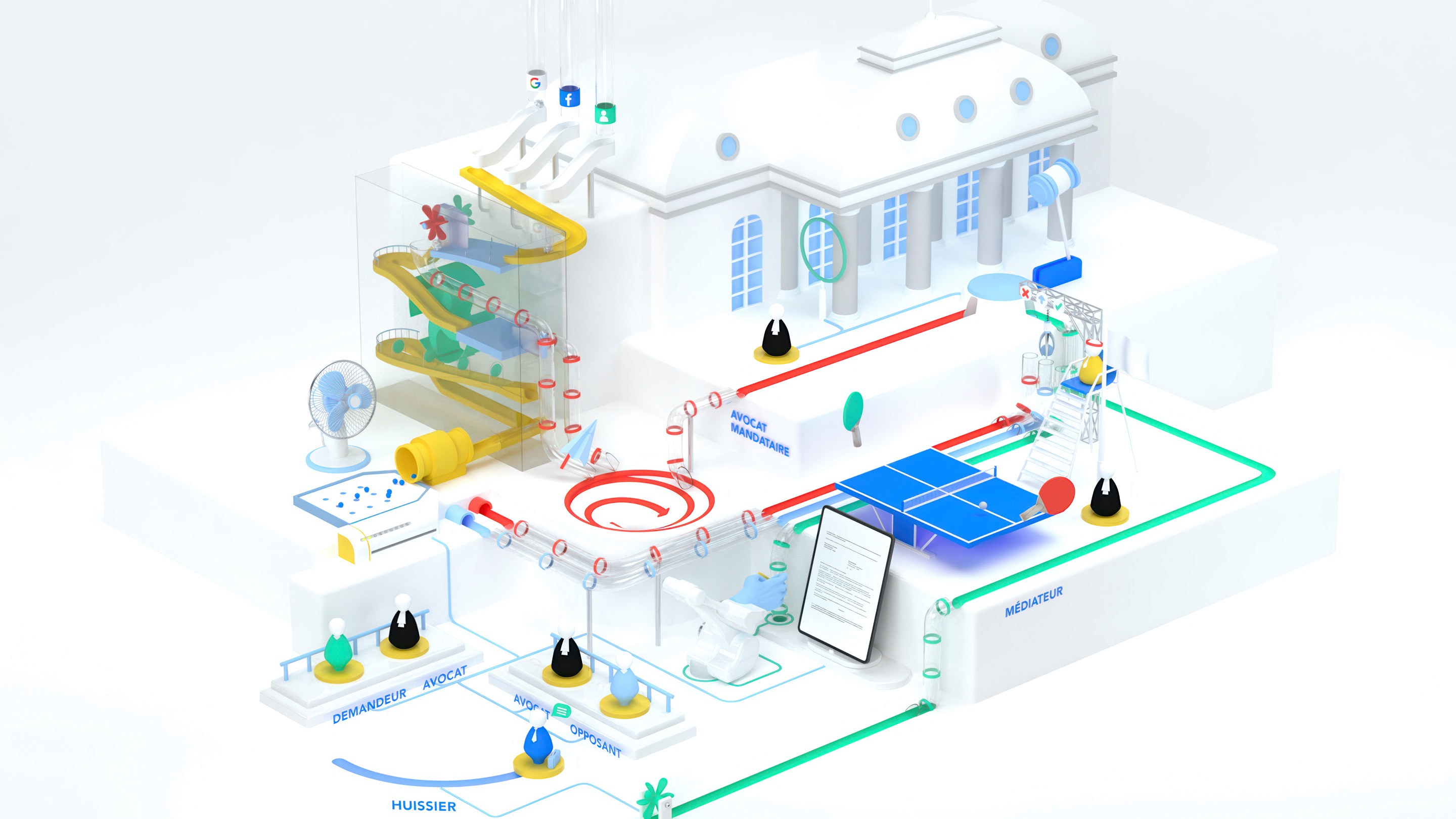Pour illustrer le processus de médiation entre clients, avocats et cours de justice nous avons imaginé un univers composé de mini-machines symboliques.